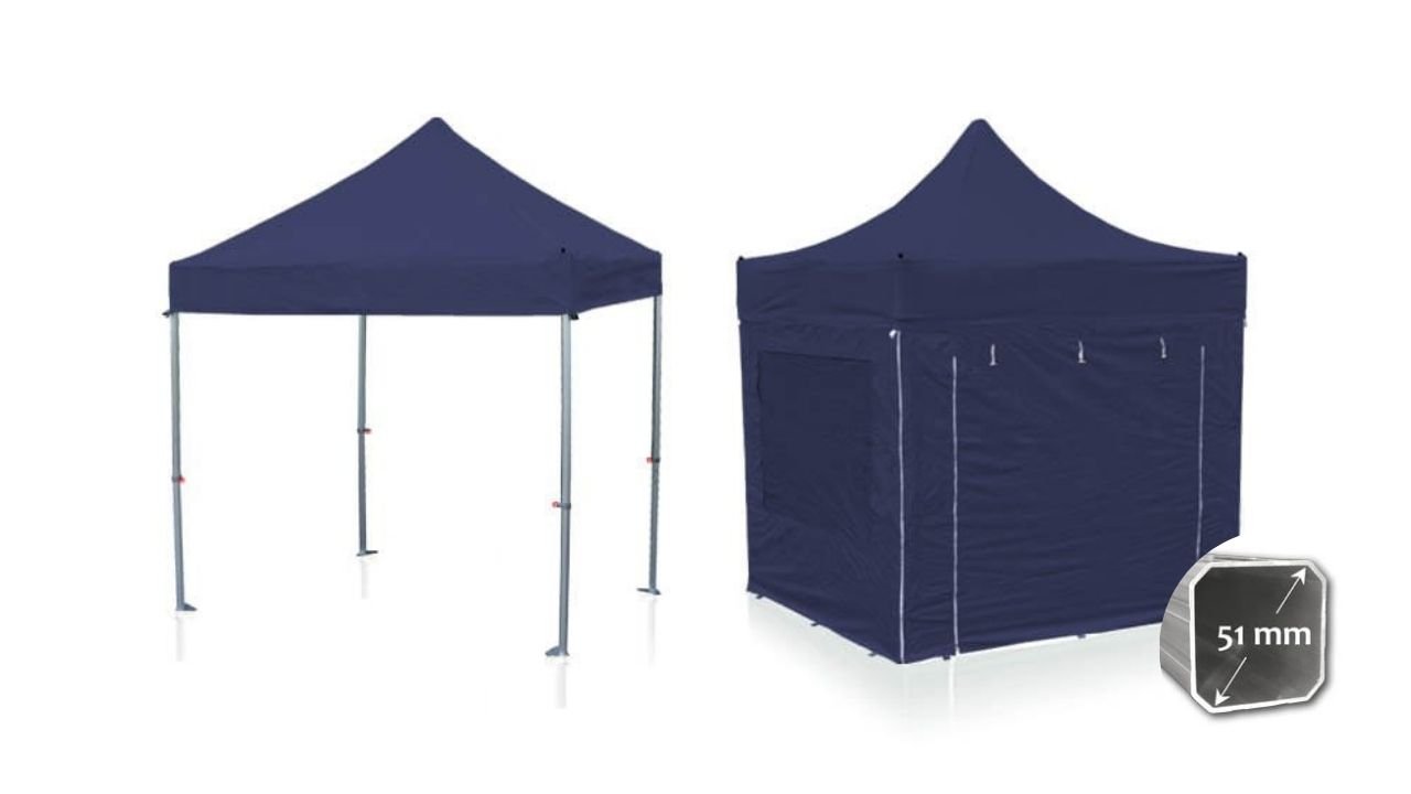 The tent is made of durable aluminum and features stable wide legs with extremely strong cast alloy joints, providing a reliable, professional shelter for various commercial events. Its high-quality polyester sidewalls and roof, coated with PVC, are fully waterproof and fire-resistant. The sturdy 600D fabric density ensures protection in all weather conditions.