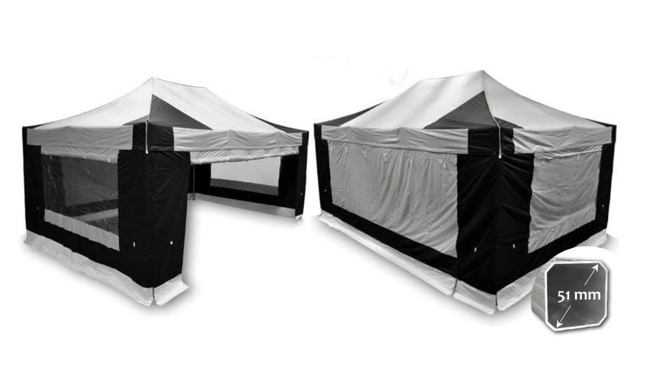 The tent is made of durable aluminum and features stable wide legs with extremely strong cast alloy joints, providing a reliable, professional shelter for various commercial events. Its high-quality polyester sidewalls and roof, coated with PVC, are fully waterproof and fire-resistant. The sturdy 600D fabric density ensures protection in all weather conditions.