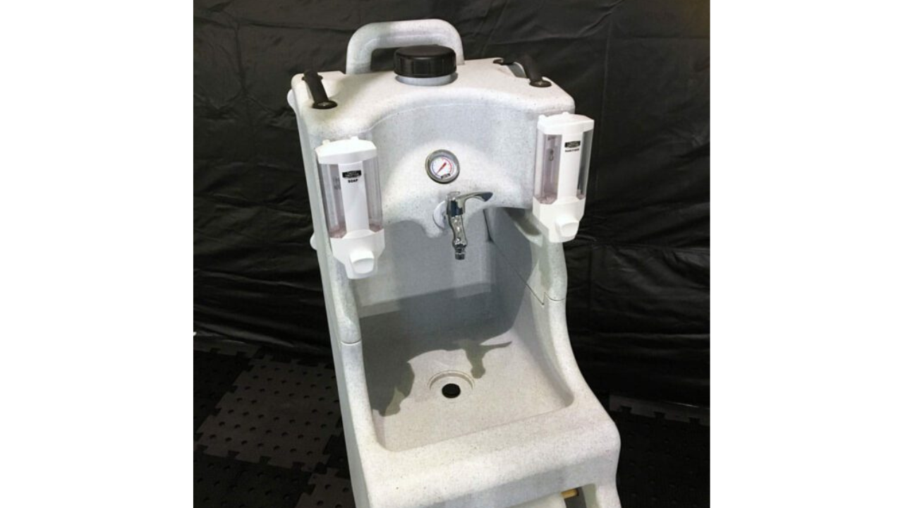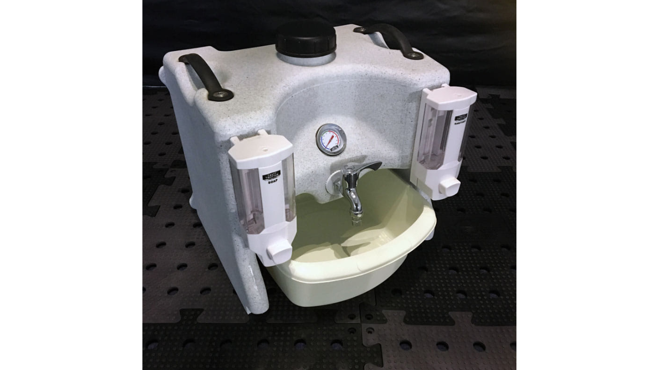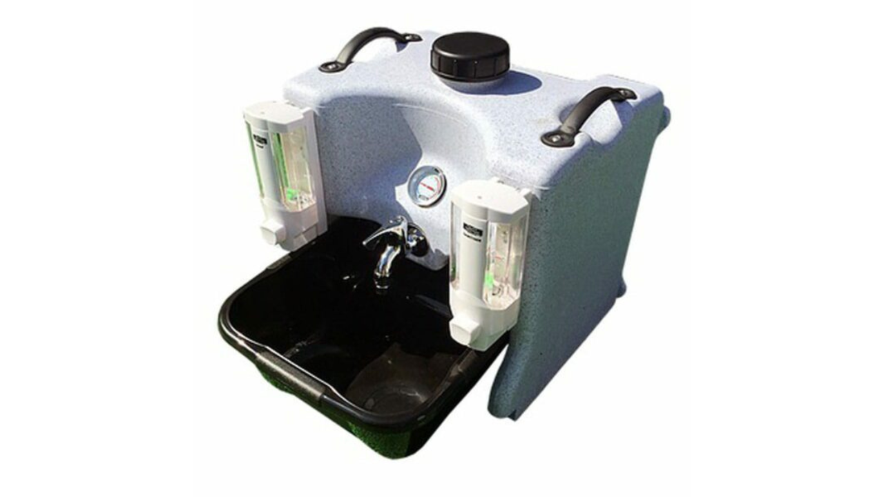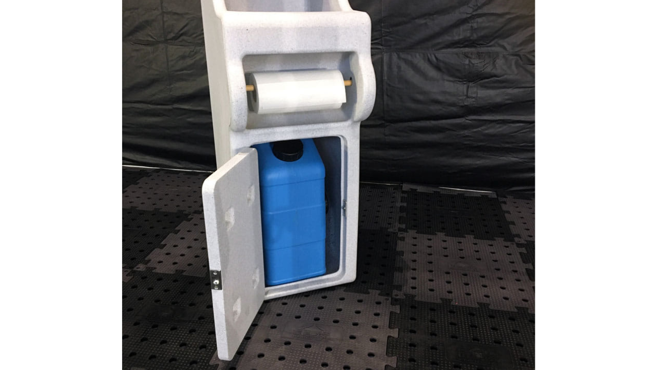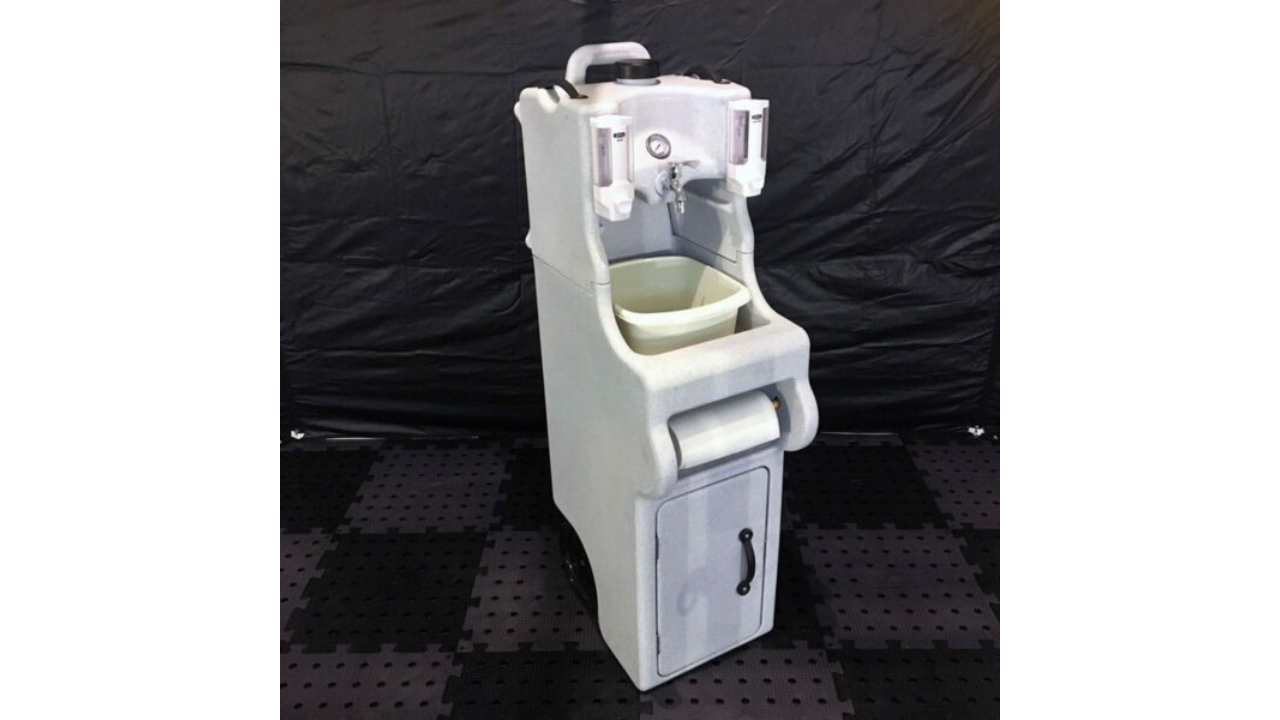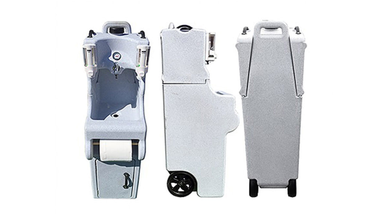 This mobile hand washing station is designed to be extremely convenient to transport and easy to use, while still providing enough space for convenient hand hygiene. In addition to a spacious washbasin, the station has a container on both sides – one for disinfectant gel, the other for soap. A roll of paper towels or toilet paper can be attached to the front to make it easy to dry your hands after washing.