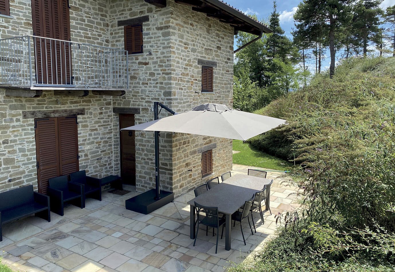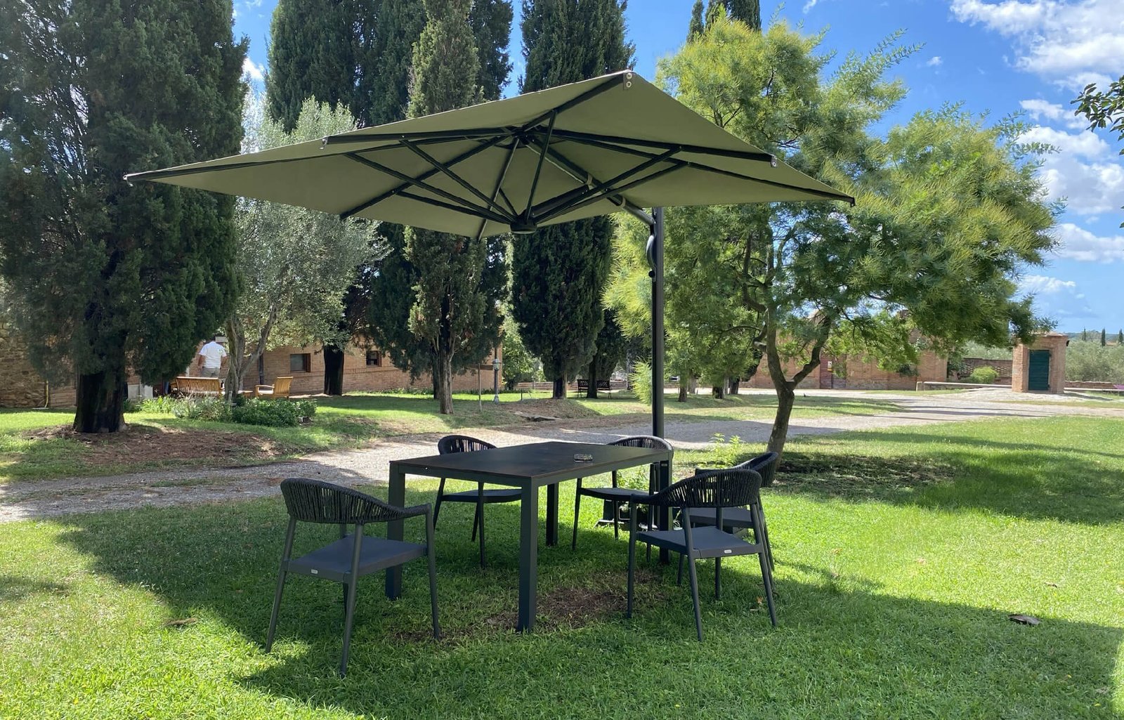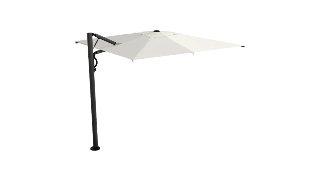 Umbrella with an innovative gas spring-assisted folding and unfolding system. The retractable design allows the umbrella to be folded and unfolded over tables and chairs without having to rearrange them. Aluminum frame with a highly durable, anthracite color. Resistant to salt water and UV rays. An innovative and highly appreciated solution for outdoor spaces.