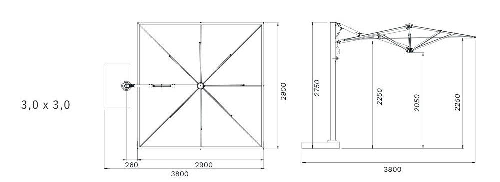 - Height of the unfolded umbrella (frame height): (3x3m): 2.75m (3.5x3.5m): 2.75m (3x4m): 2.75m