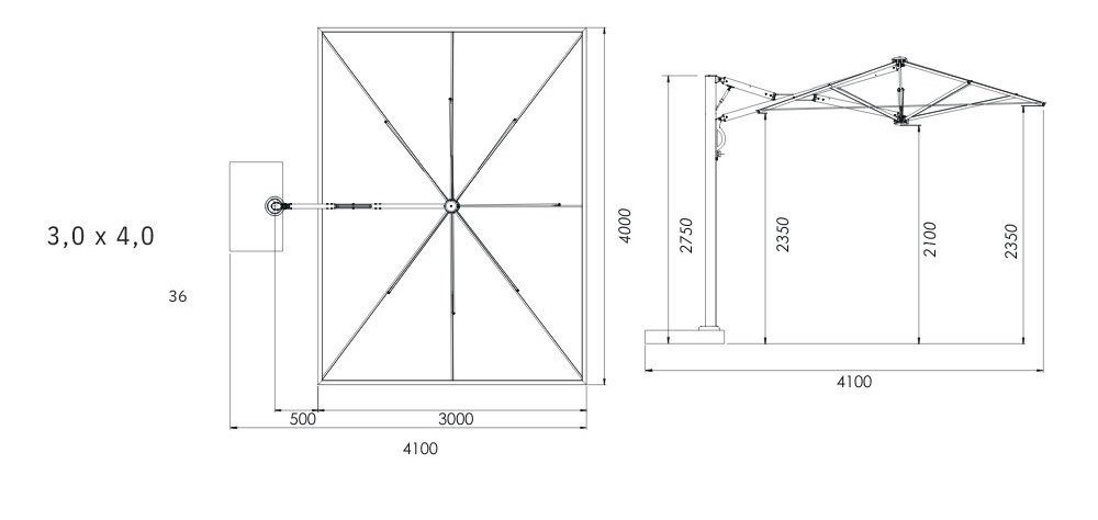 - Height of folded umbrella: (3x3m): 2.95m (3.5x3.5m): 3.15m (3x4m): 3.15m
