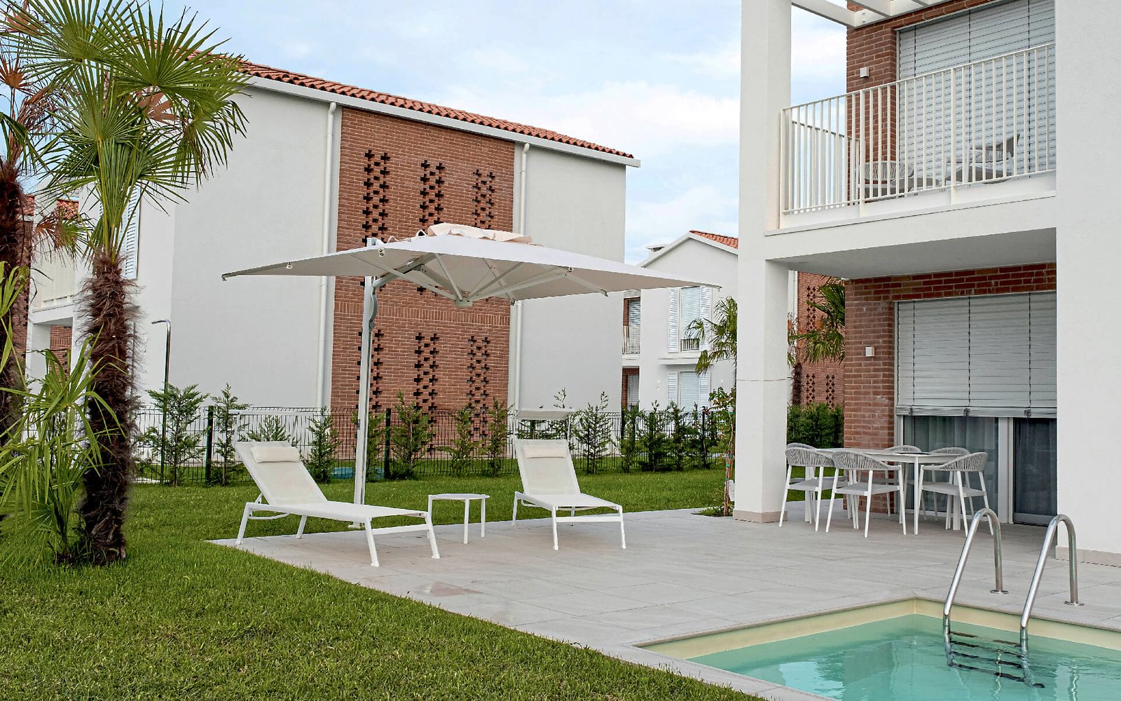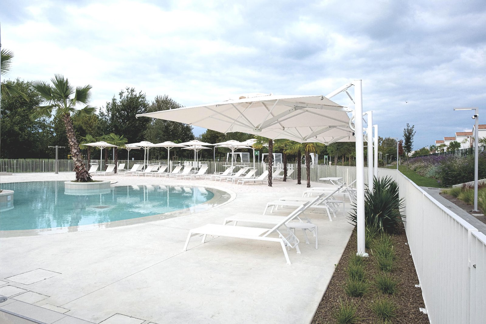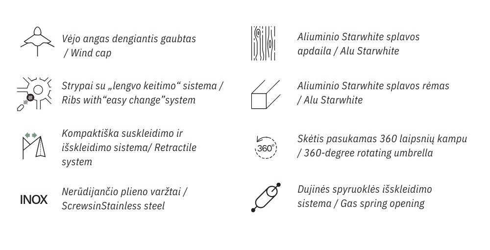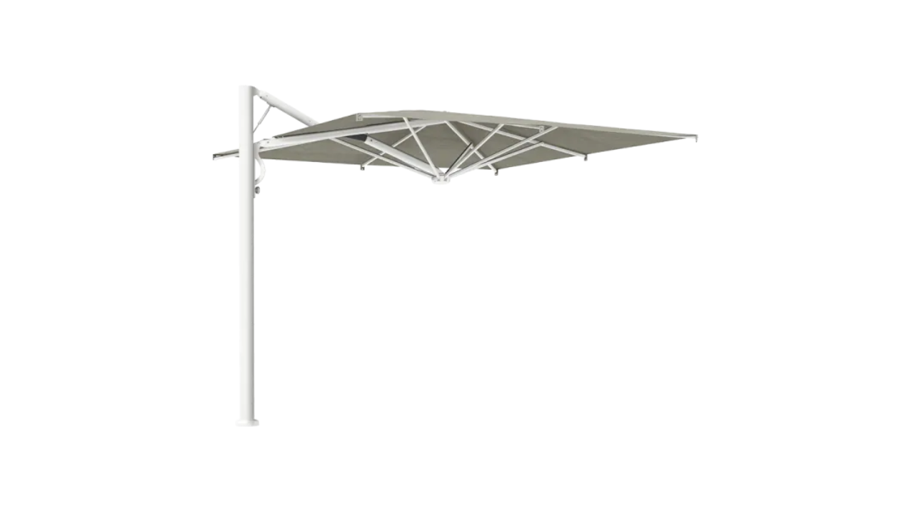 Umbrella with an innovative gas spring-assisted folding and unfolding system. The retractable design allows the umbrella to be folded and unfolded over tables and chairs without having to rearrange them. Aluminum frame with a highly durable, white color. Resistant to salt water and UV rays. An innovative and highly appreciated solution for outdoor spaces.