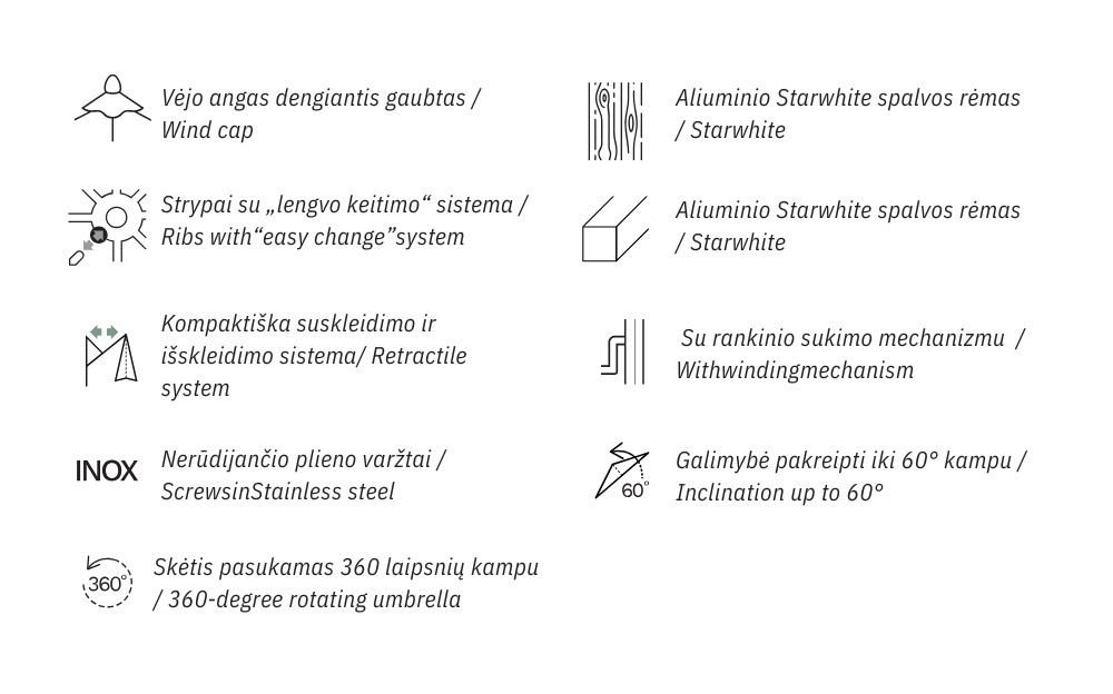 Umbrella with a unique folding and unfolding mechanism integrated into the support, which allows you to easily fold the umbrella without moving furniture. This umbrella has a reinforced frame and a larger canopy.