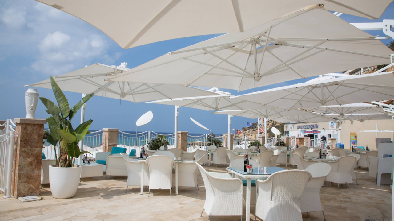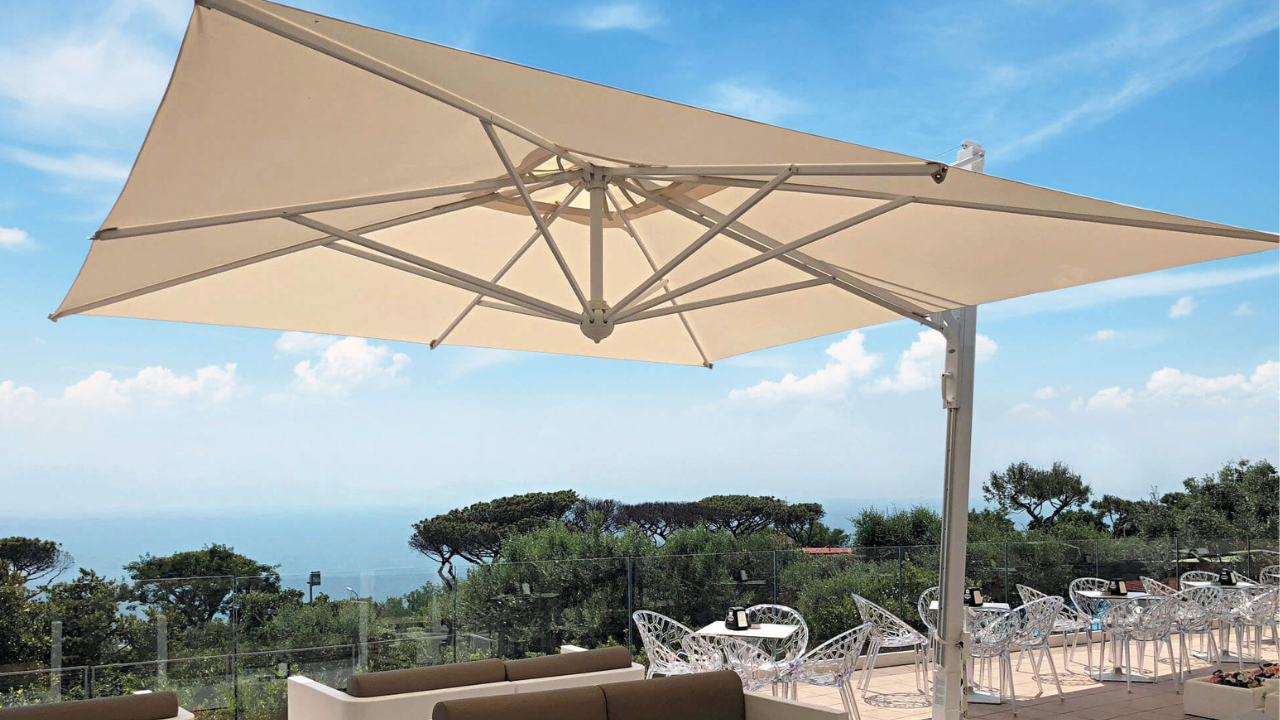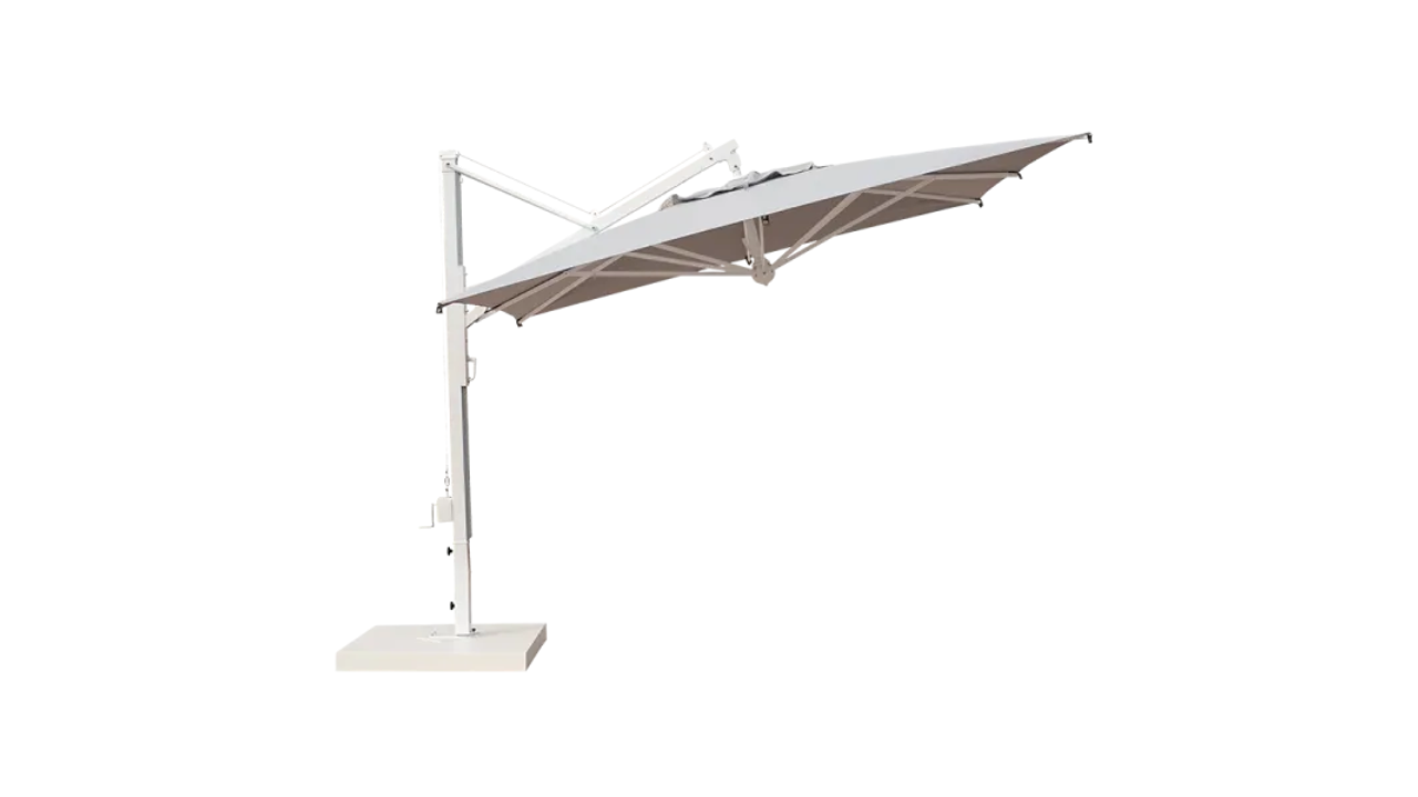 Umbrella with a unique folding and unfolding mechanism integrated into the support, which allows you to easily fold the umbrella without moving furniture. This umbrella has a reinforced frame and a larger canopy.