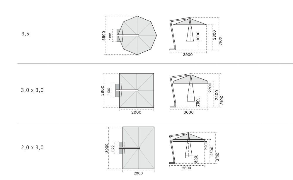- Height to the beginning of the umbrella, without skirt: (3.5ø): 2.3m (3x3m): 2.4m (2x3m): 2.5m (3x2): 2.5m (3x4m): 2.35m