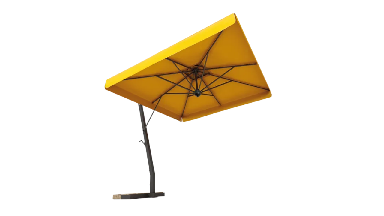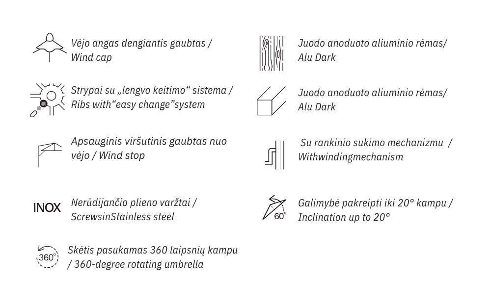 Umbrella with epoxy-coated aluminum frame, updated aluminum black color. Perfect for modern and sophisticated spaces.