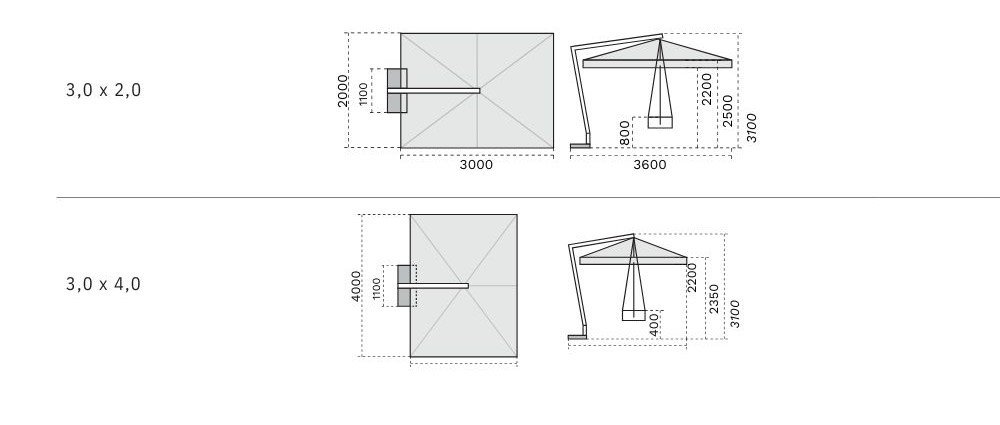 - Folded umbrella from base to beginning of umbrella: (3.5ø): 1m (3x3m): 75cm (2x3m): 80cm (3x2): 80cm (3x4m): 40cm