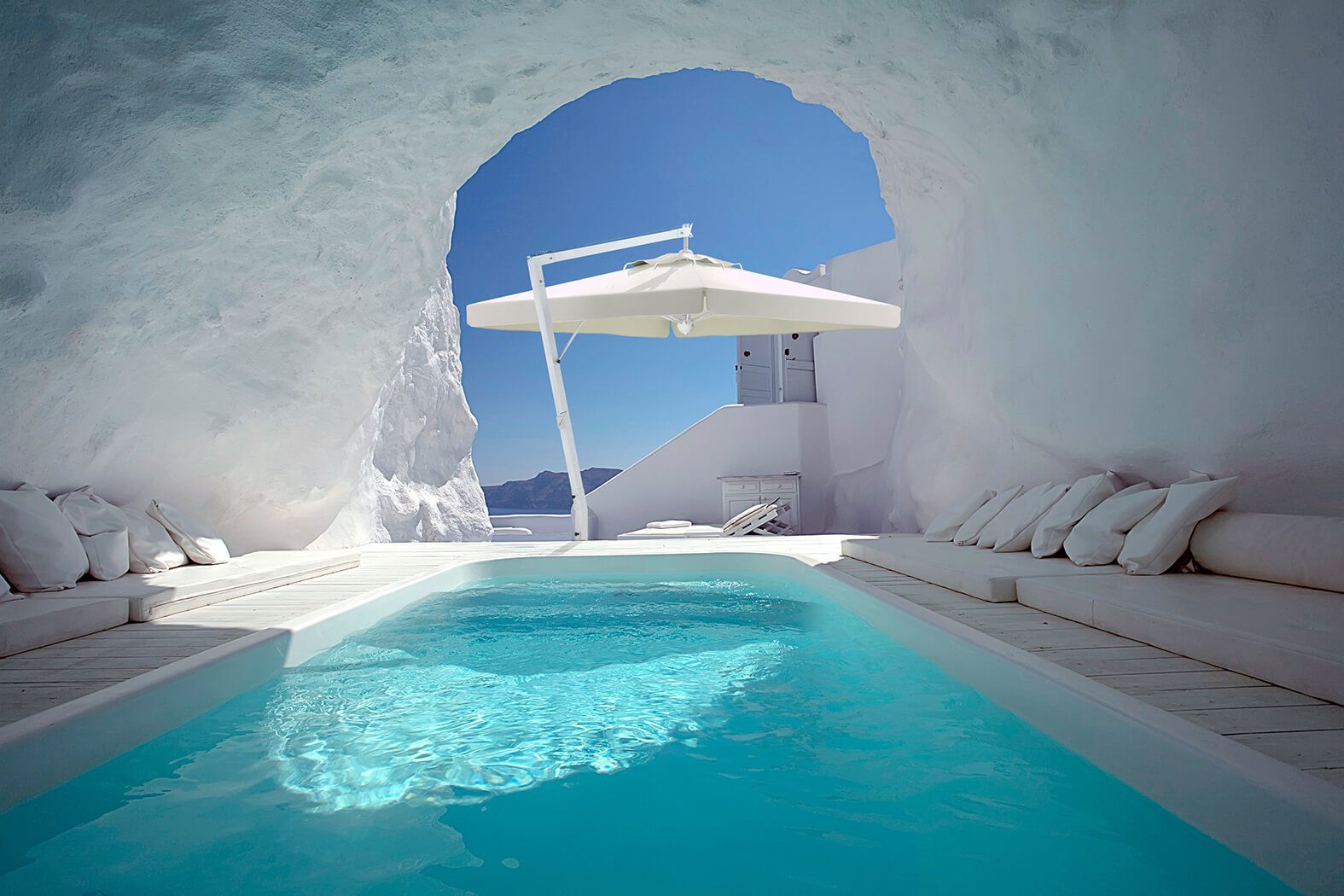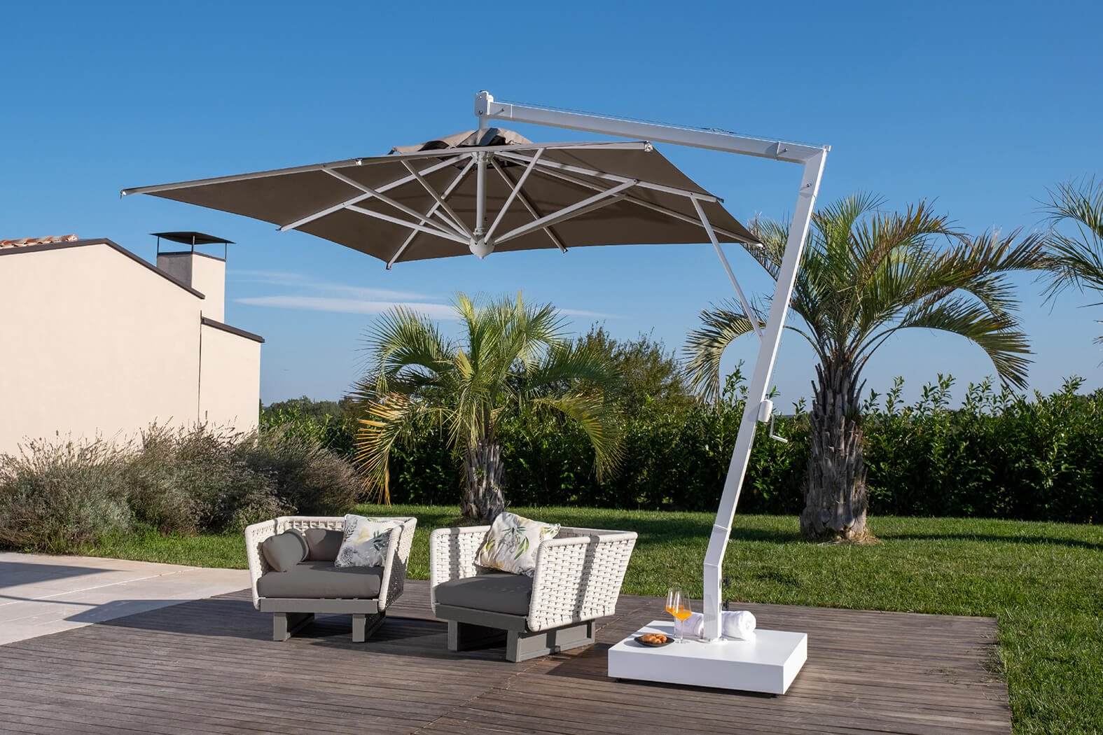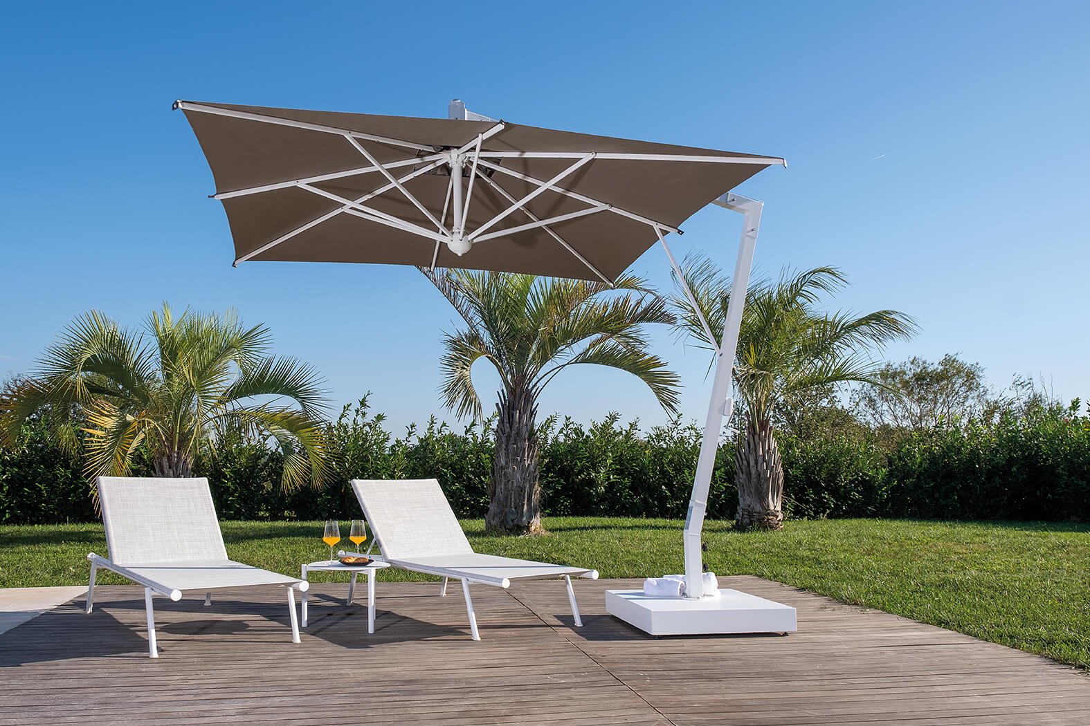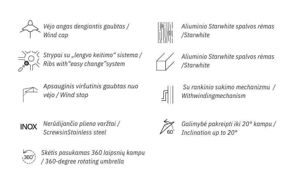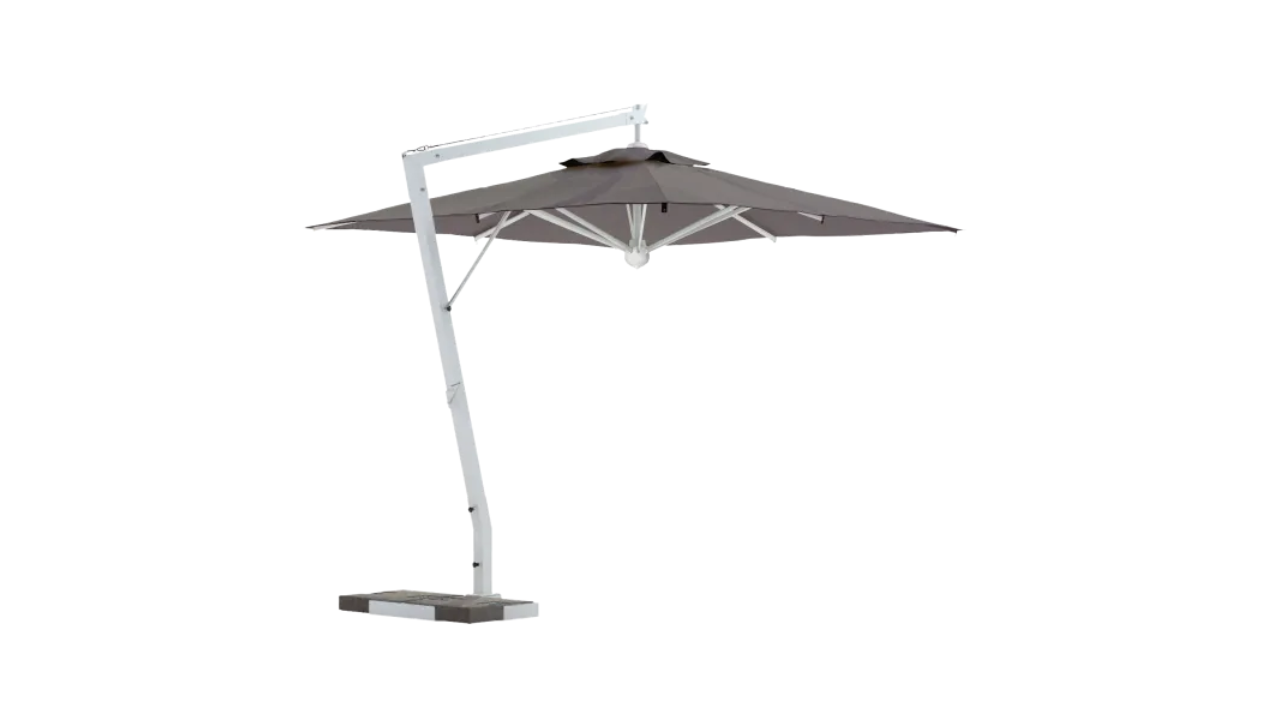 Umbrella with epoxy-coated aluminum frame, updated aluminum white color. Perfect for modern and sophisticated spaces.