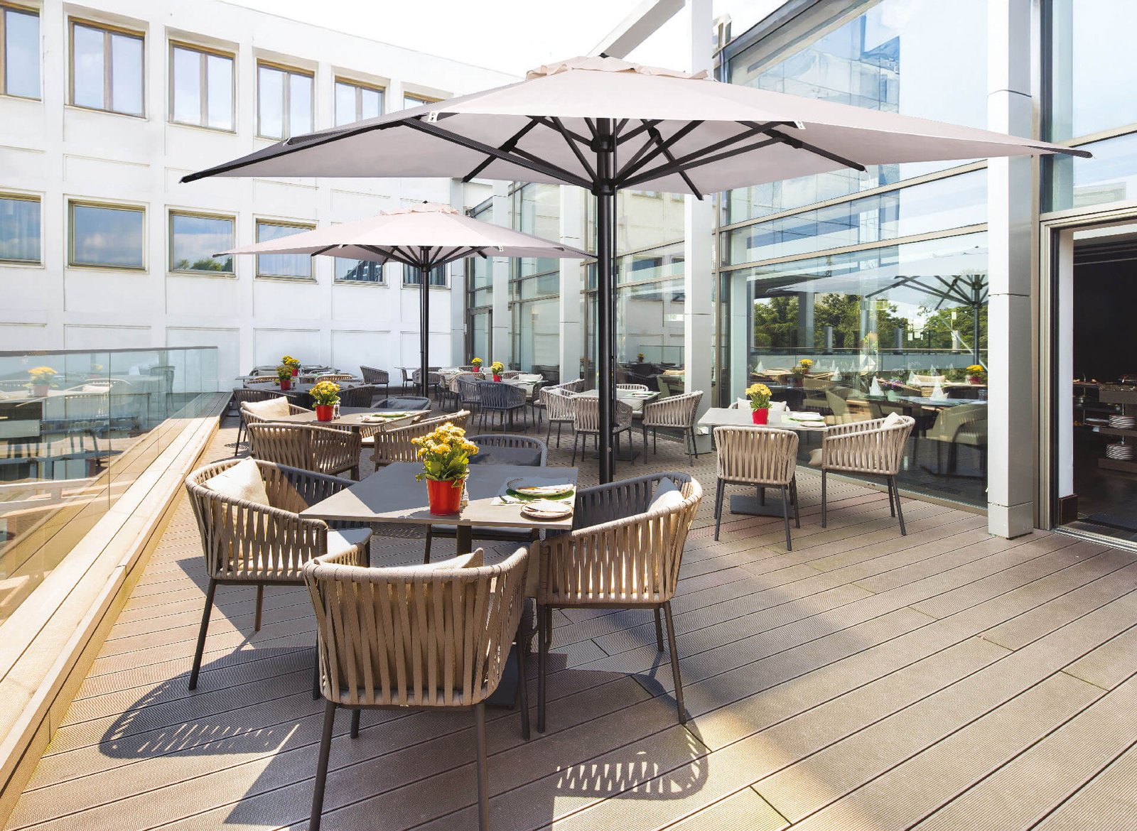 When developing this model, the structural strength was adapted to the intended dimensions, and an 80 mm diameter pole is used for the base. Improved components make the umbrella even easier to use, making it perfect for professional use – in the outdoor areas of hotels, restaurants and bars.