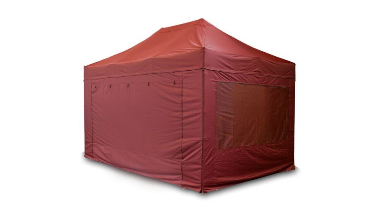 - 4 atskiros šoninės sienelės (poliesteris su vidine PVC danga), įskaitant: 2 langus su vidinėmis užuolaidėlėmis (plotis 2 m) o 2 užlenkiamas/užtrauktuku uždaromas duris (plotis 3 m) – pasirenkama opcija