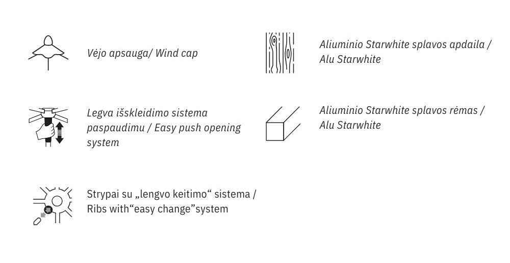 Išskirtinis, minimalistinis dizainas ir inovatyvus pavėsio sprendimas suteikia skėčiui šiuolaikišką charakterį. „Push-up“ tipo atidarymo ir uždarymo sistema leidžia skėtį valdyti lengvai ir elegantiškai. Šis modelis puikiai pritaikytas intensyviam profesionaliam naudojimui – idealiai tinka paplūdimiams, baseinų erdvėms ir prabangiems kurortams, kur vertinamas funkcionalumas, kokybė ir estetiška išvaizda.